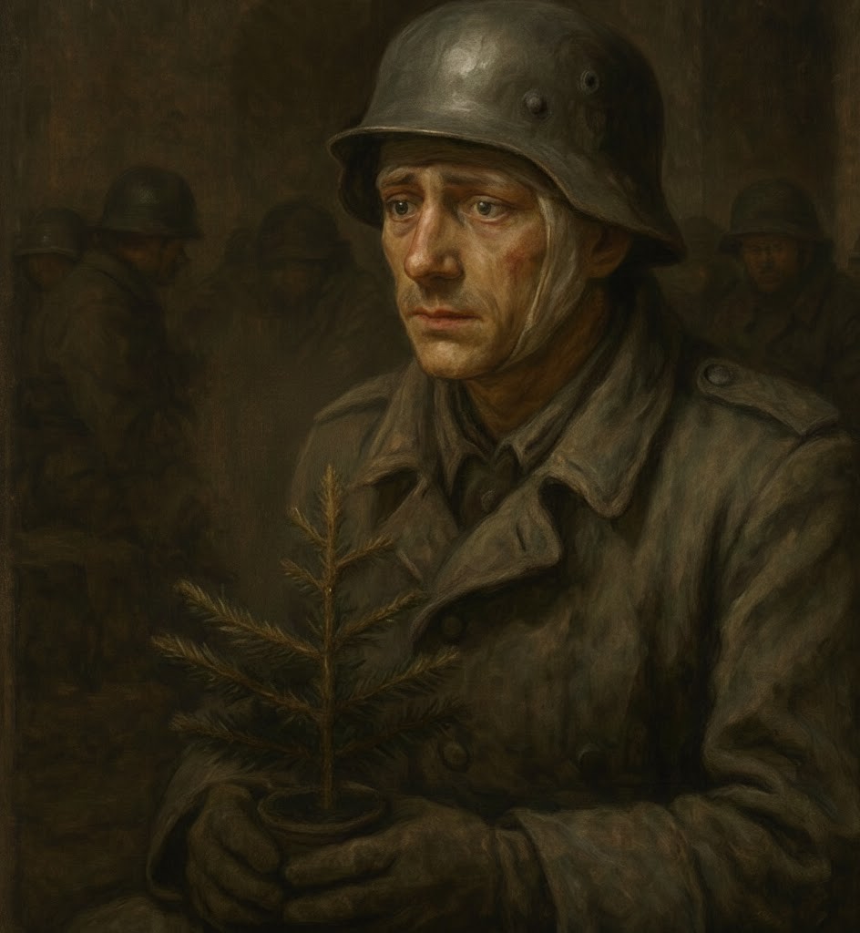 Eingeklemmt in der gefrorenen Erde versuchten sie einen Hauch von Normalität zu bewahren, sich nur mal ein paar Stunden dem Grauen entziehen. Sie taten ihr Bestes, diesen einen Abend als den Weihnachtsabend zu empfinden. Ein spärlich geschmückter Tannenbaum, mühsam im Schnee ausgegraben, war mit ein paar Kerzen geschmückt. Ein Päckchen aus der Heimat ließ der Nacht ein wenig den Schrecken nehmen. Der Schein der Kerzen besiegte für einen kurzen Moment die Verzweiflung. Irgendwo da draußen sollte doch noch eine heile Welt existieren, auf die es sich zu hoffen lohnte? In dieser Nacht waren sie wieder Menschen und nicht nur Soldaten.